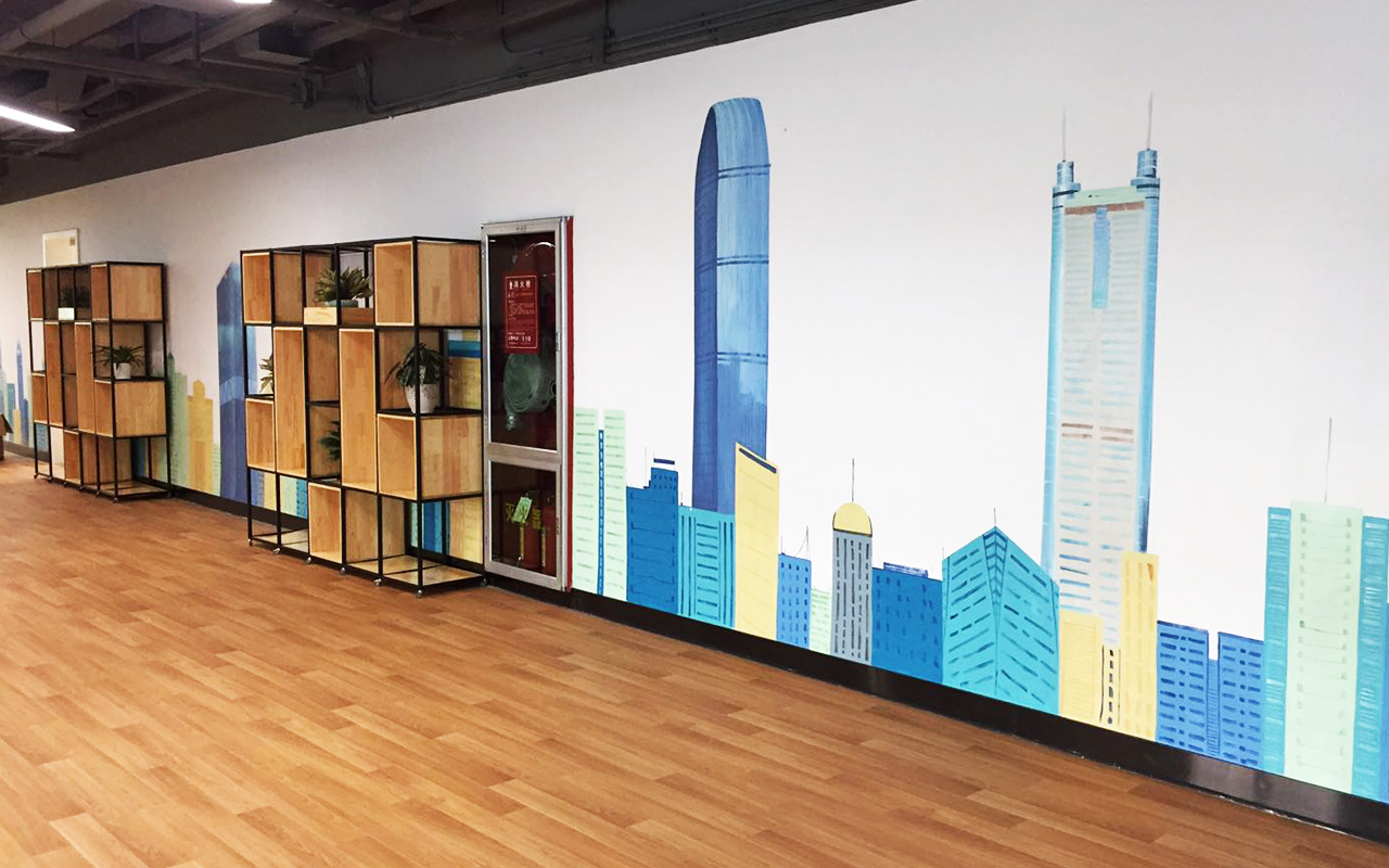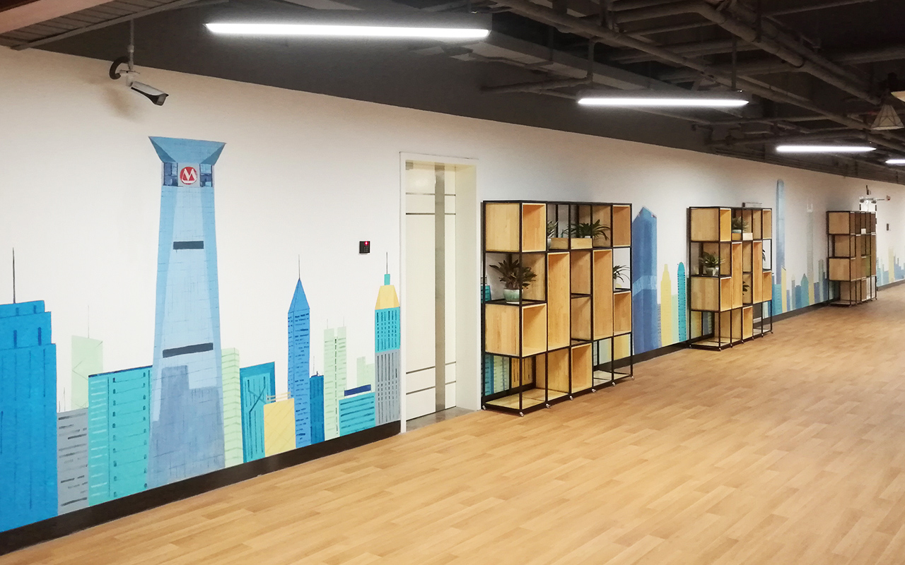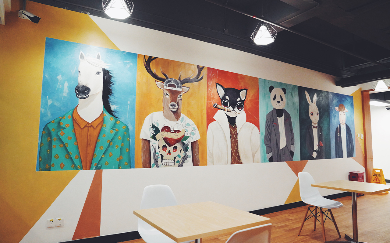 由于墻體普遍較大,我們采用大量原創(chuàng)墻繪(手繪)+輕型材料的解決方案