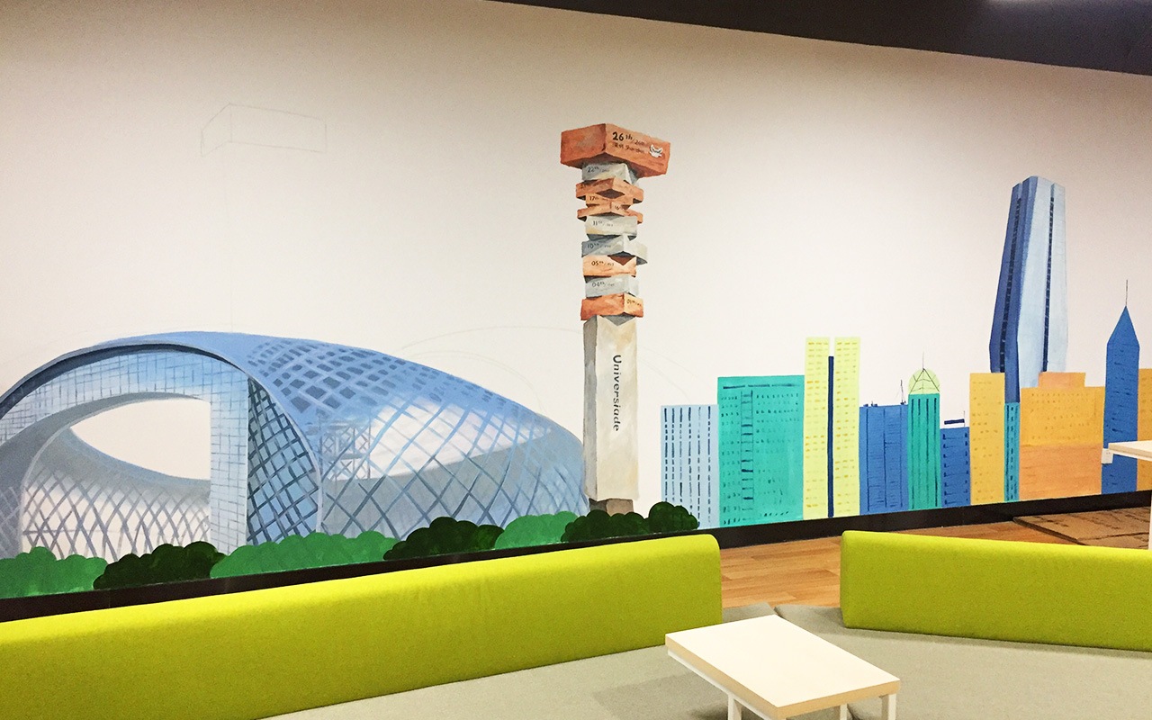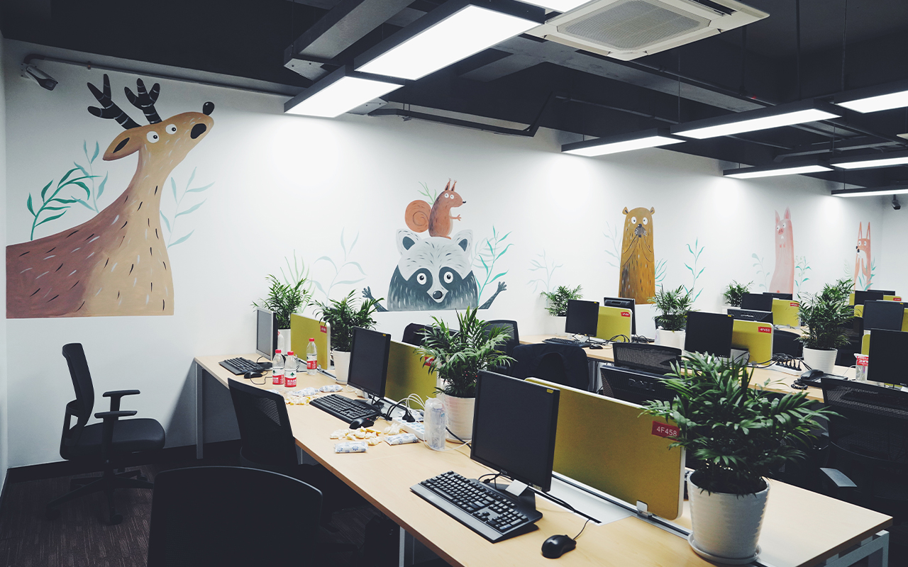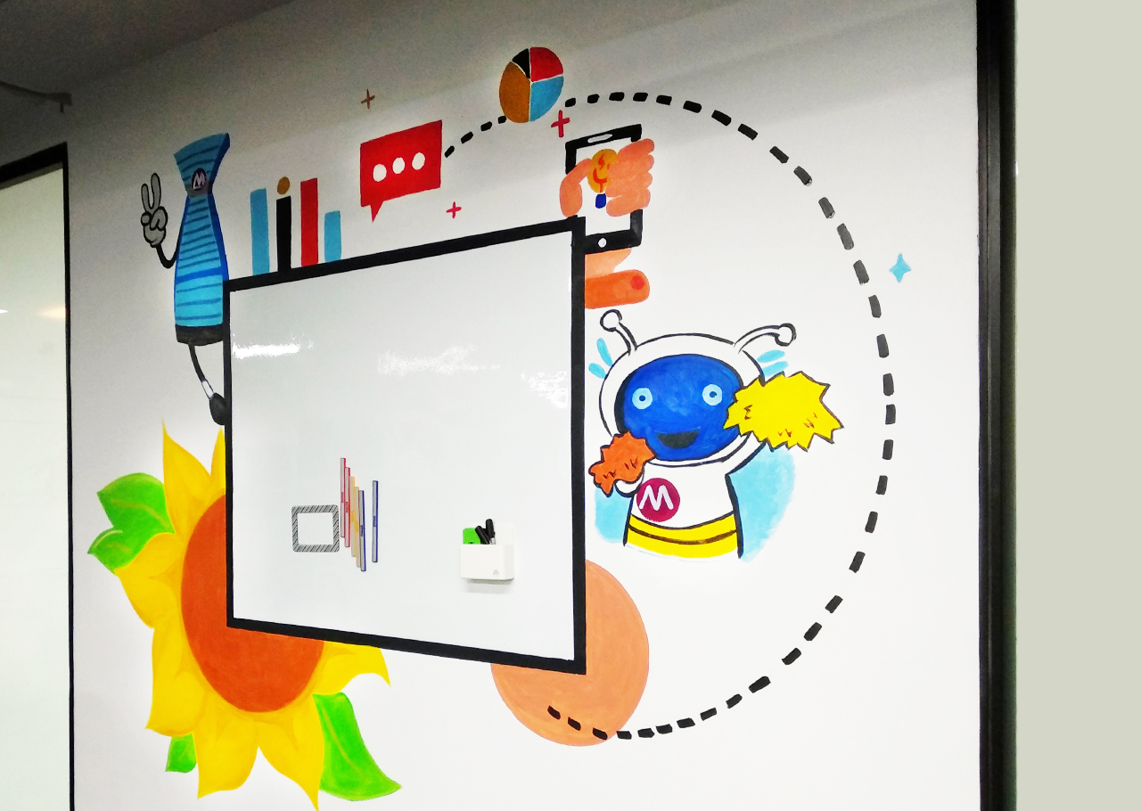 由于墻體普遍較大,我們采用大量原創(chuàng)墻繪(手繪)+輕型材料的解決方案