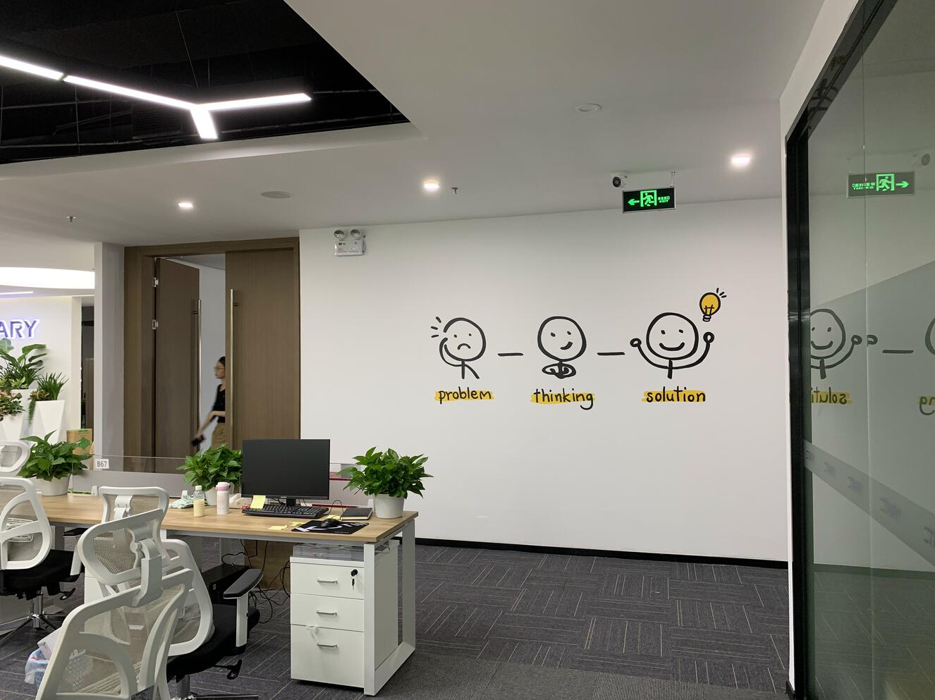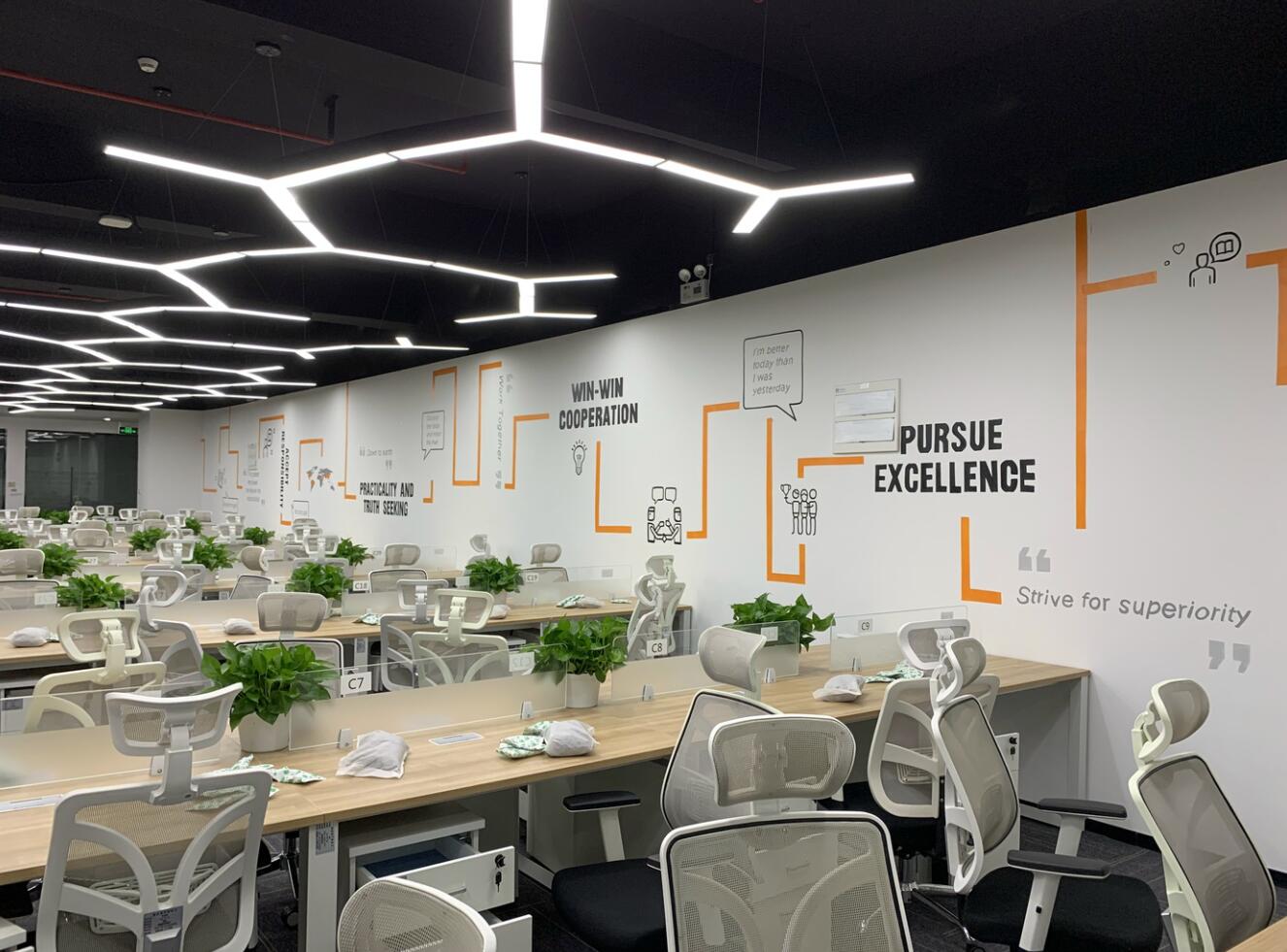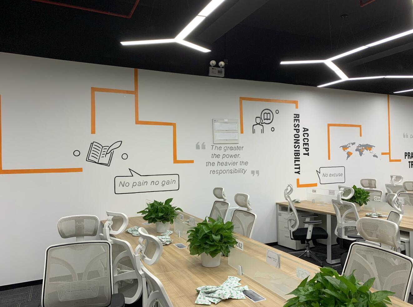 整體輕裝飾、不破壞墻體。辦公家具已入位固定,員工已陸續搬入。