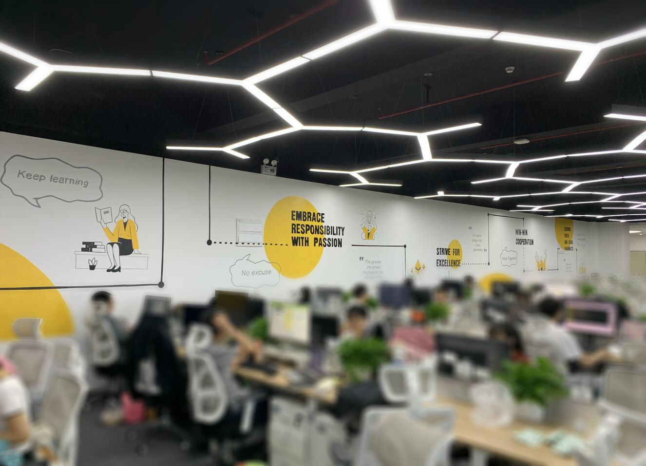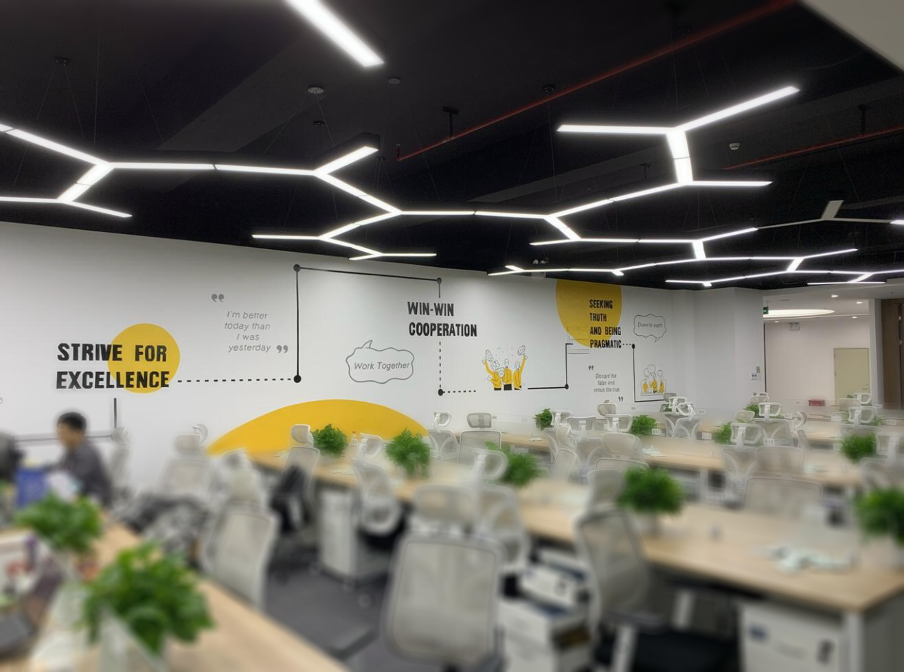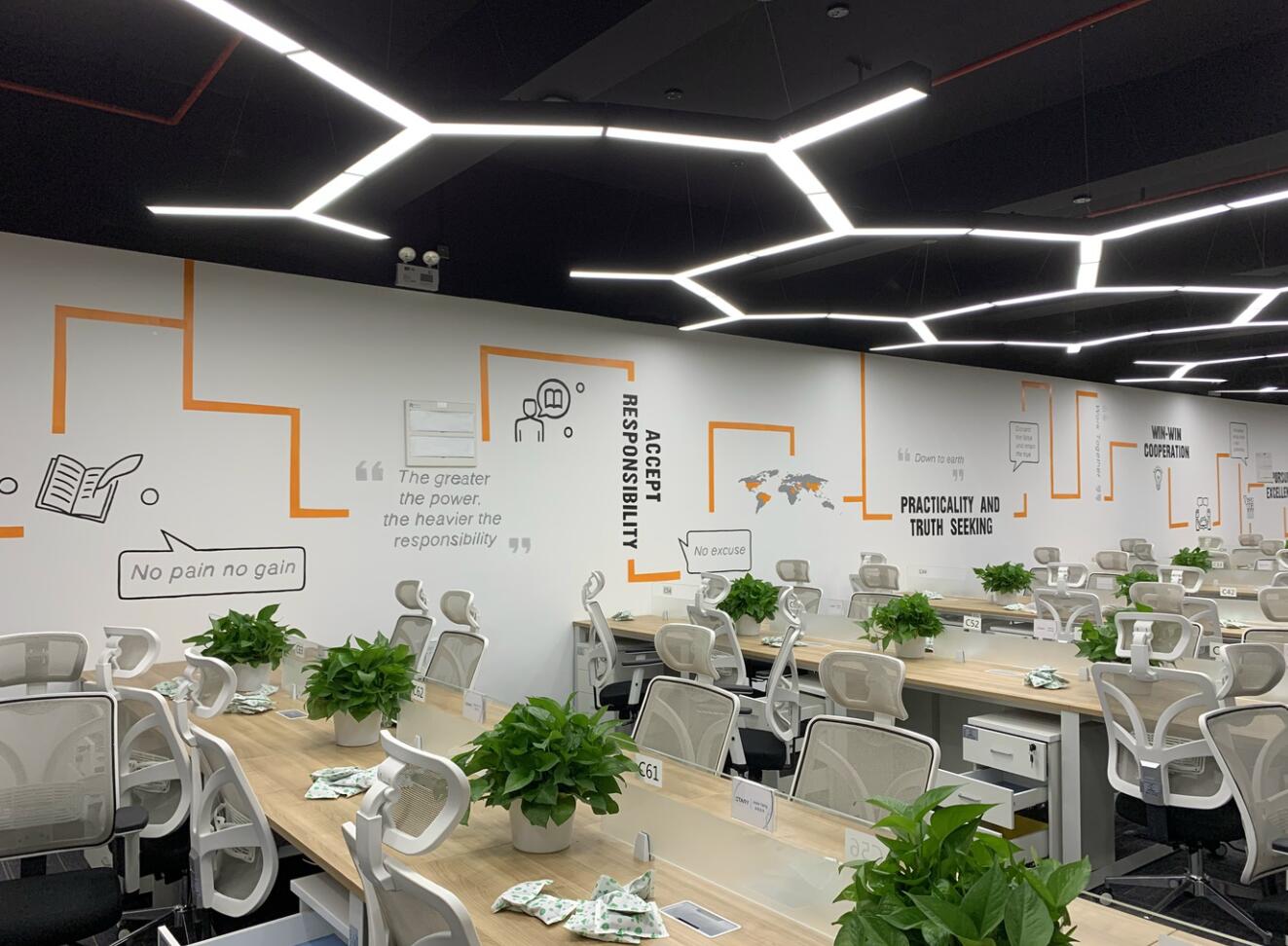整體輕裝飾、不破壞墻體。辦公家具已入位固定,員工已陸續搬入。